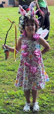 I ADORE this picture of Annie at May Day, ... with her decorated bunny ears and her fairy wand and her flutter wings, ... and her little fairy face! : ) It wasn't long before that face was painted and the fairy wand was even MORE flowery! BUT look at how Annie BEGAN the day: kitty hat w/roses. What happened to that? Not enough, I see with her love of bunnies! Even Shana & Tina (Annie's teachers) got into the action with a neat play, ... but the highlight of any May Day is always the Maypole!!! And WOW did Mountain Sun have a GREAT one! : )